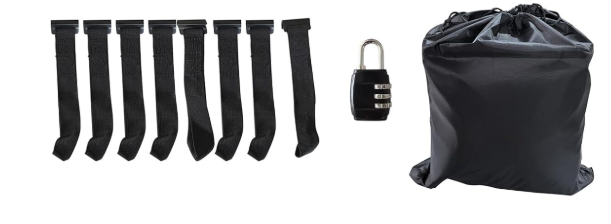 Koruyucu pedler, kapı kancaları, kilitler, büzgülü çantalar.